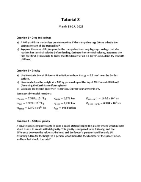 | Title | PHYS 100 - Tutorial 8 - Tutorial 8 March 15-17, 2022 Question 1 – Drag and springs a) A 40 kg ... |